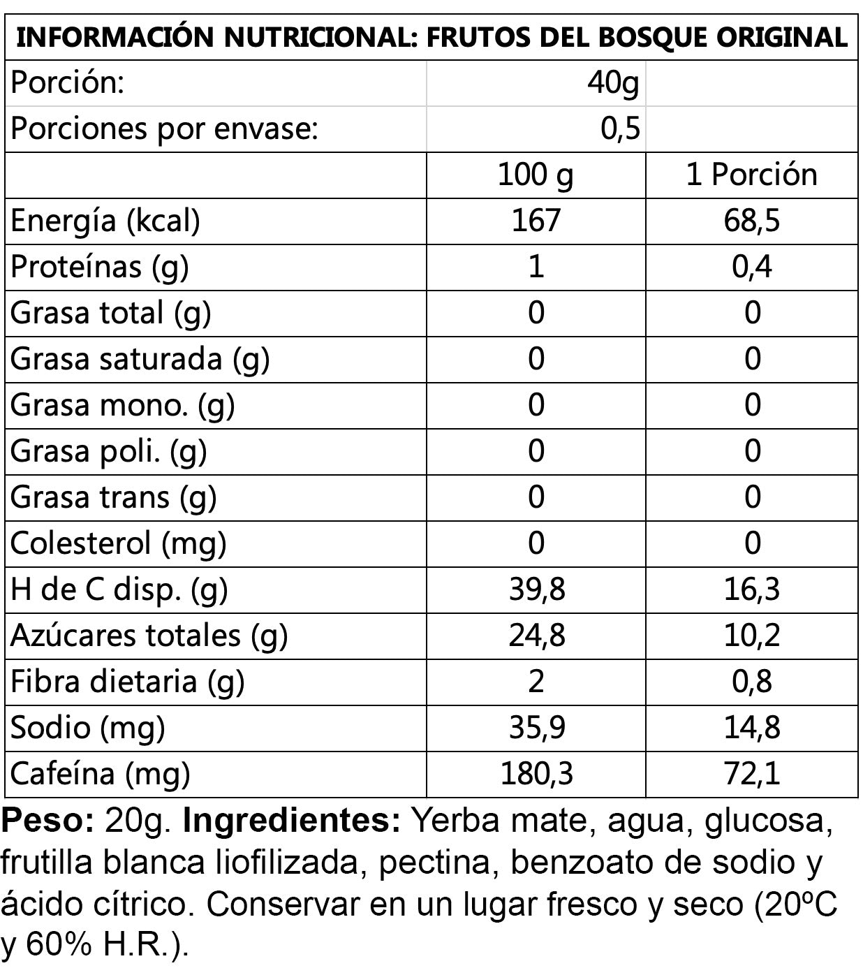 Original: Esta línea contiene glucosa y fructosa en proporción 2:1 y 72,1 mg de cafeína por porción (además de los otros compuestos activos de la yerba mate). Este gel esta diseñado para aquellas personas que esporádicamente realizan alguna actividad física o necesitan un boost de energía extra en sus actividades. Si disfrutas de largas caminatas con tu familia, te vas de trekking cada fin de semana que puedes, tienes un trabajo con un horario demandante o necesitas un shot de energía extra para tus estudios ¡Éste gel está diseñado para tí!