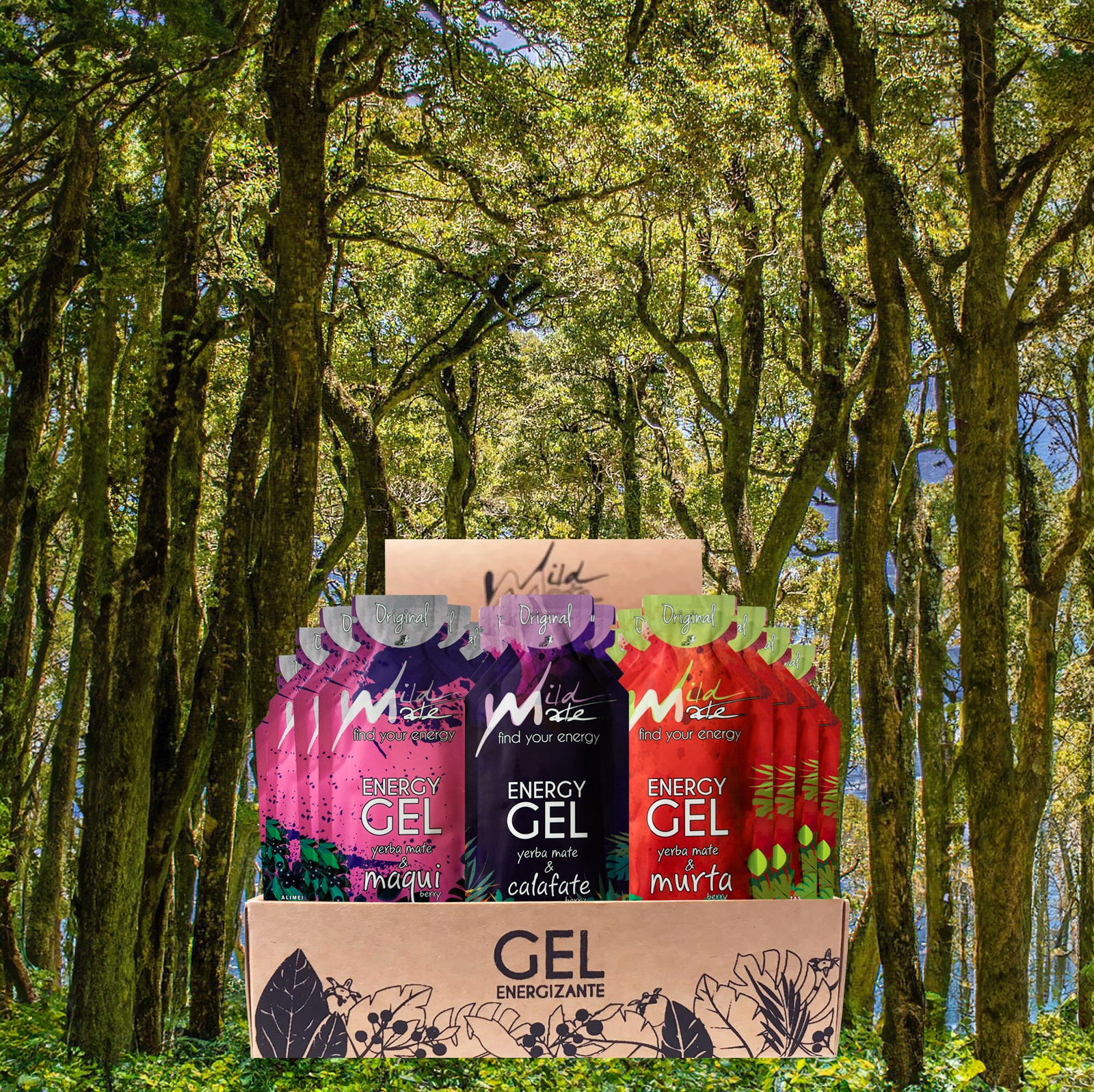 Wildmate Pack Calafate, Maqui y Murta: Mix de geles energizantes de 20 gramos sabor 🔵 Calafate (Fragaria chiloensis), 🟣 Maqui (Aristotelia chilensis) y 🔴 Murta (Ugni molinae); plantas nativas del Sur de Chile y Patagonia. Estos berries son comestibles y de los más característicos y conocidos del sur de Chile.