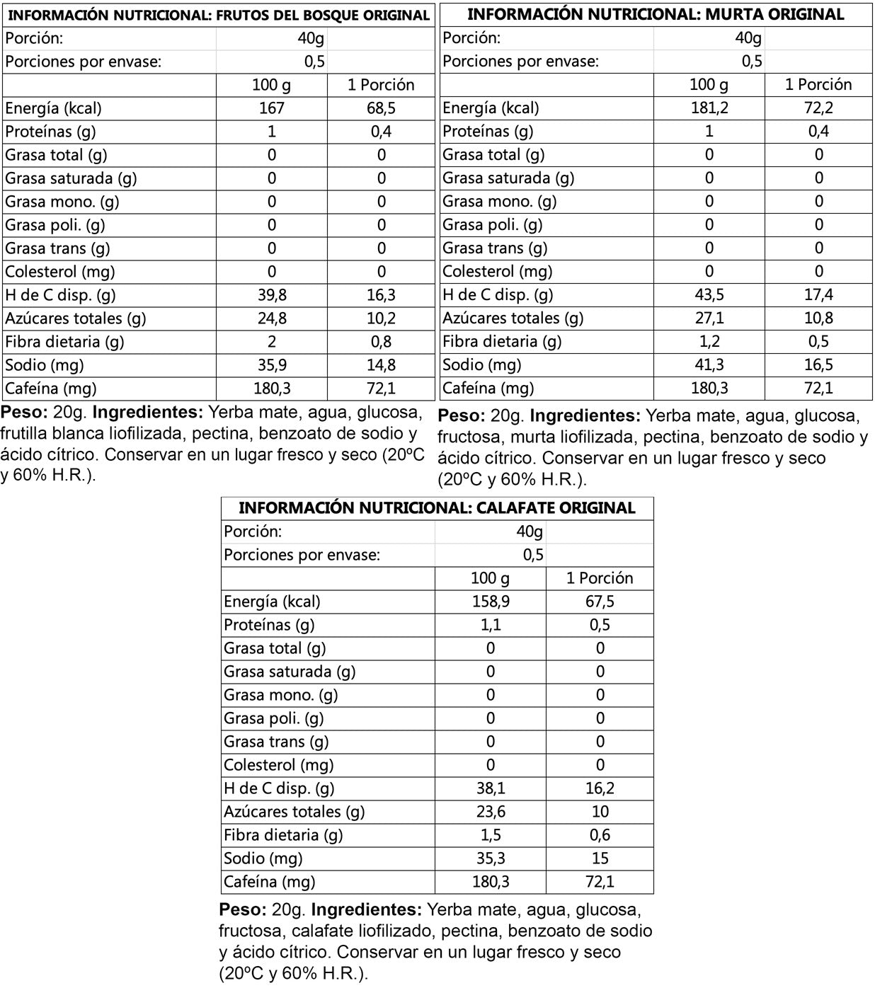 Original: Esta línea Original contiene glucosa y fructosa en proporción 2:1 y 72,1 mg de cafeína por porción (además de los otros compuestos activos de la yerba mate). Este gel esta diseñado para aquellas personas que esporádicamente realizan alguna actividad física o necesitan un boost de energía extra en sus actividades. Si disfrutas de largas caminatas con tu familia, te vas de trekking cada fin de semana que puedes, tienes un trabajo con un horario demandante o necesitas un shot de energía extra para tus estudios ¡Éste gel está diseñado para tí!
